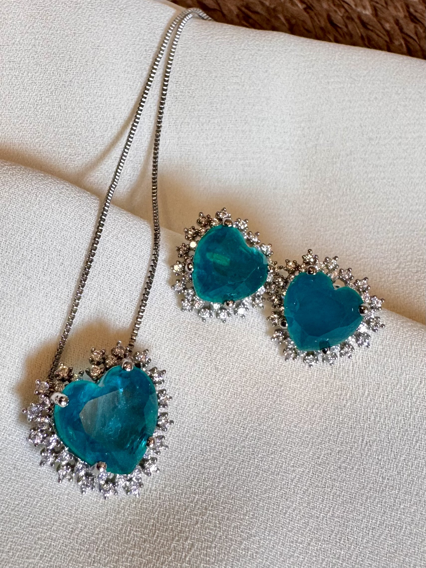 Conjunto em Pedra Fusion Verde Esmeralda, no formato de coração.