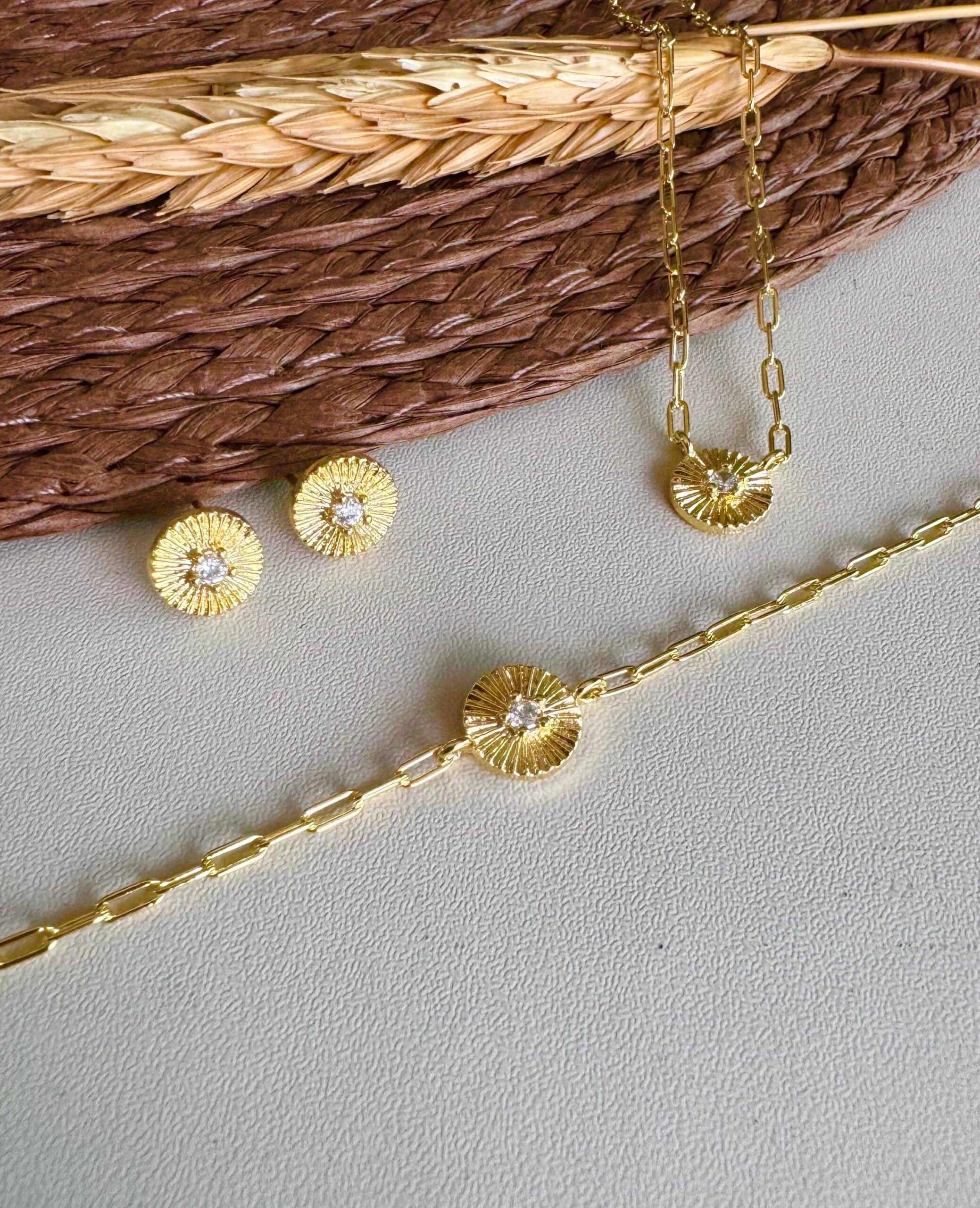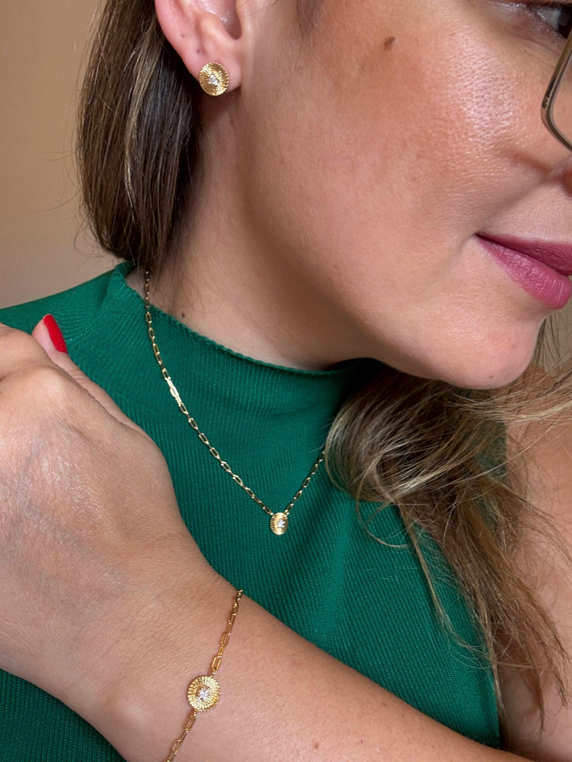 Para quem busca um modelo fora do basico, este conjunto é o ideal, todo em correntaria delicada, com um ponto de luz trabalhado no centro.